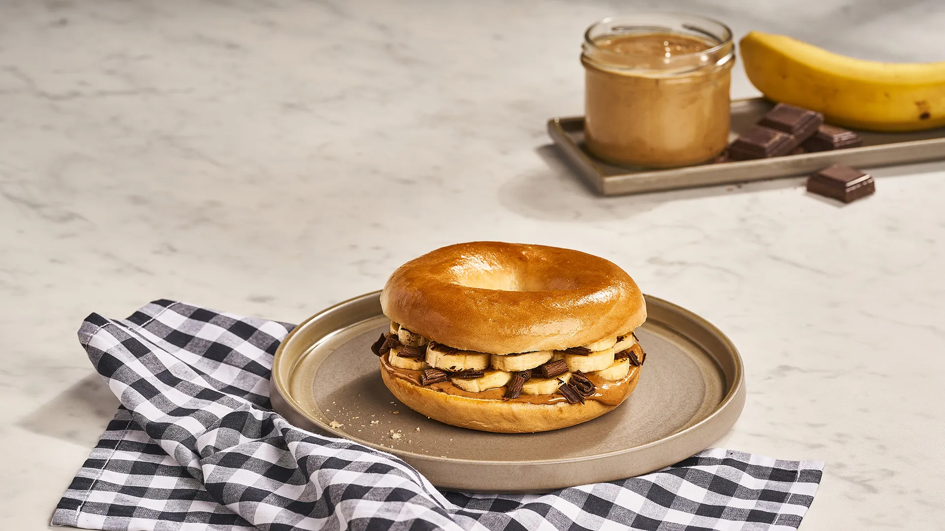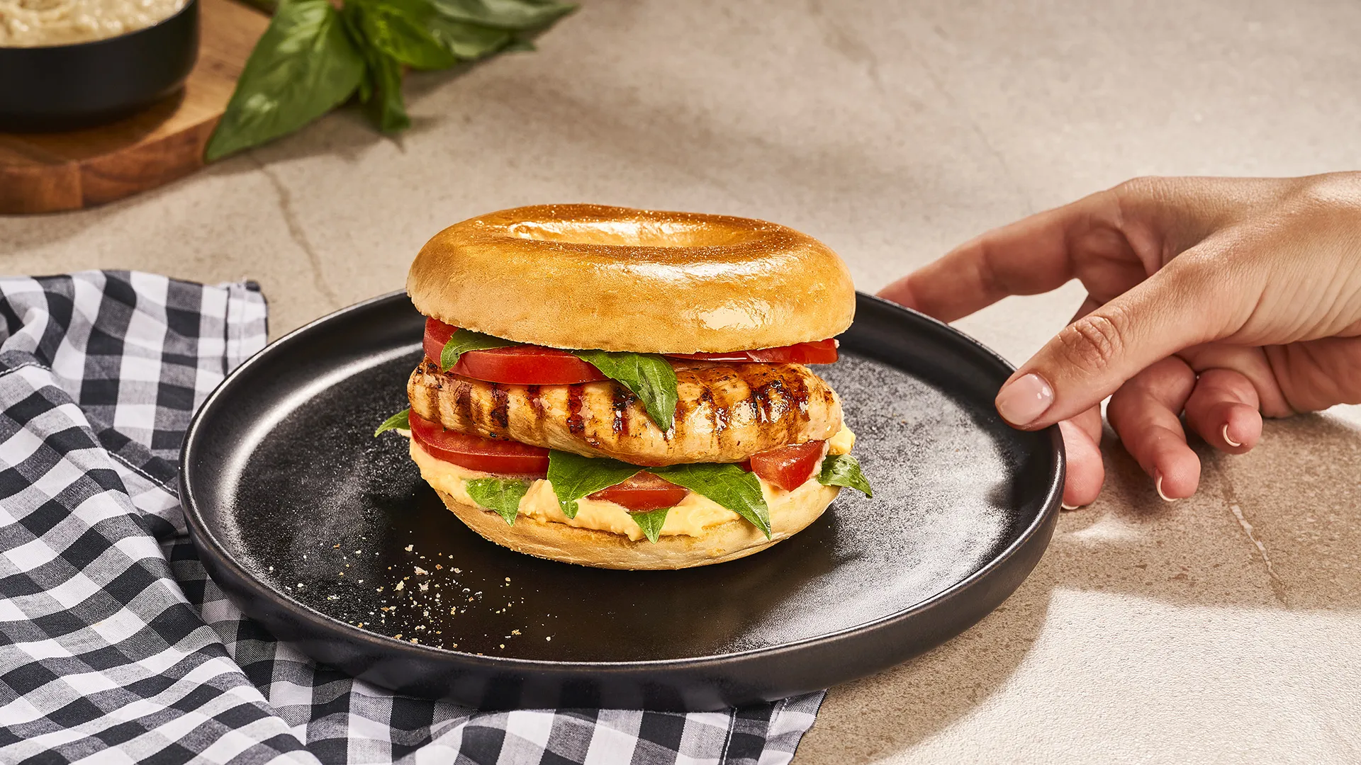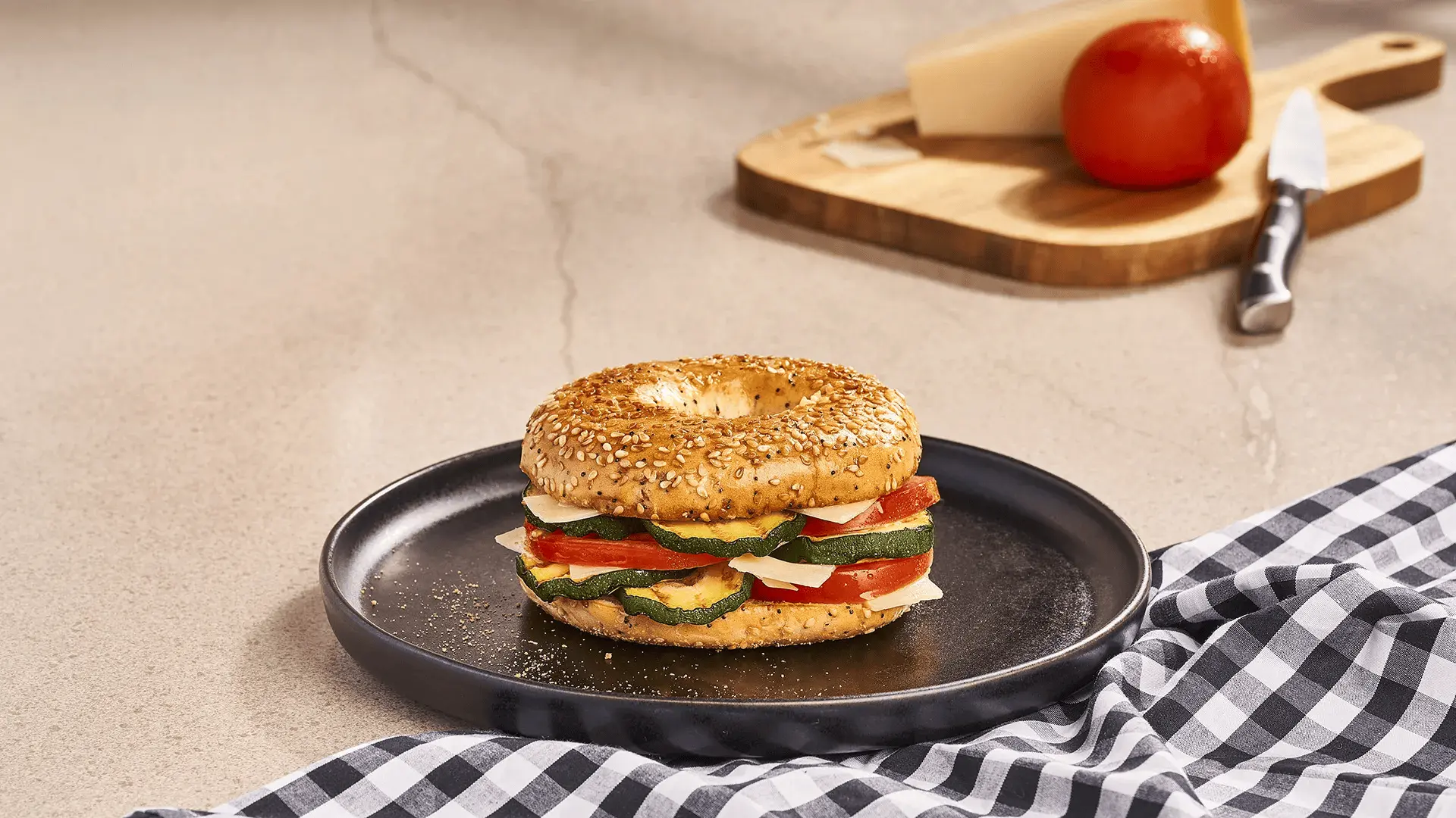 Grilled zucchini bagel with tomato, Parmesan cheese shavings, and vinaigrette