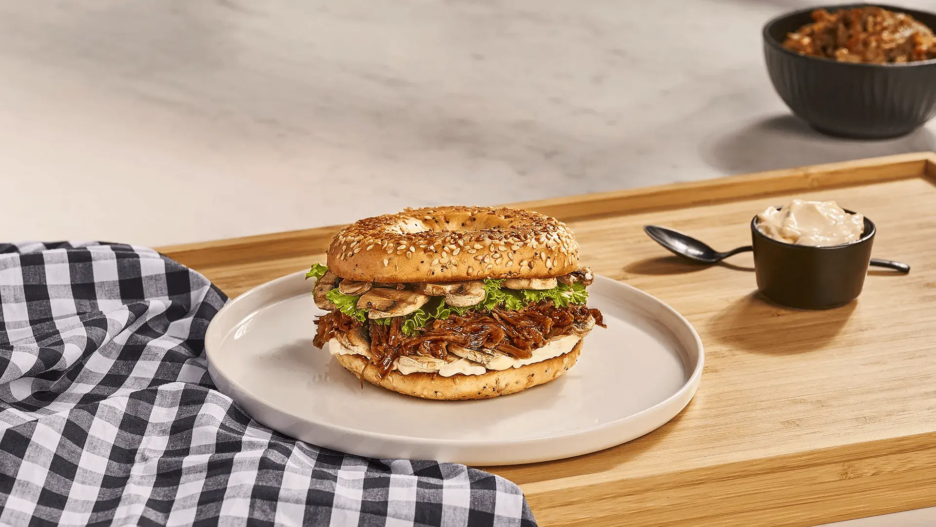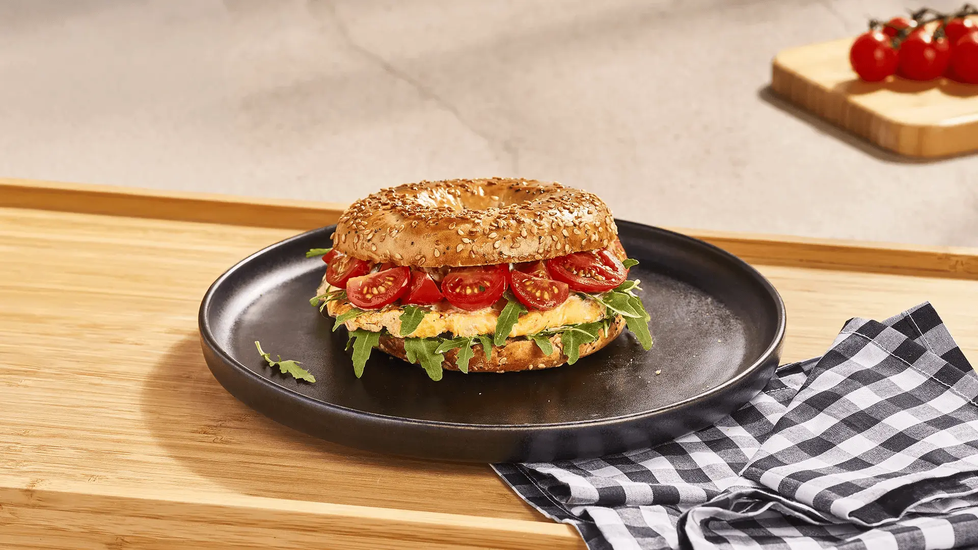 French omelet bagel with arugula and cherry tomatoes with yogurt sauce